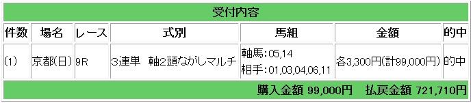上記2頭が2,3着となり218.7倍的中で72万1710円の払い戻しとなりました。