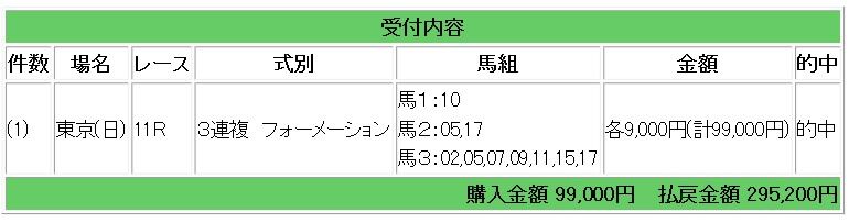 会員様には上記情報馬からの3連複指示で32.8倍的中となり、29万5200円の払い戻しとなりました。
